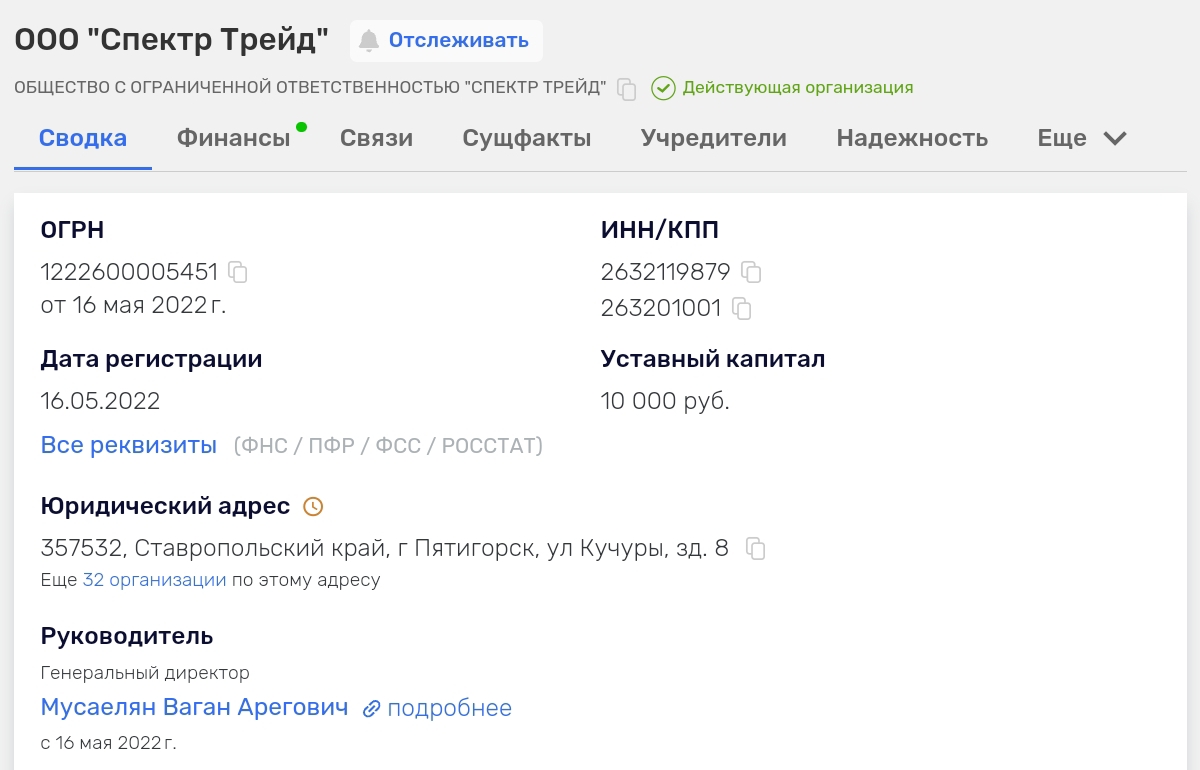 Компания «Спектр Трейд» официально зарегистрирована в 2022 году с минимально возможным уставным капиталом. Это уже может указывать на то, что фирма — так называемая «однодневка», а не серьезная компания.