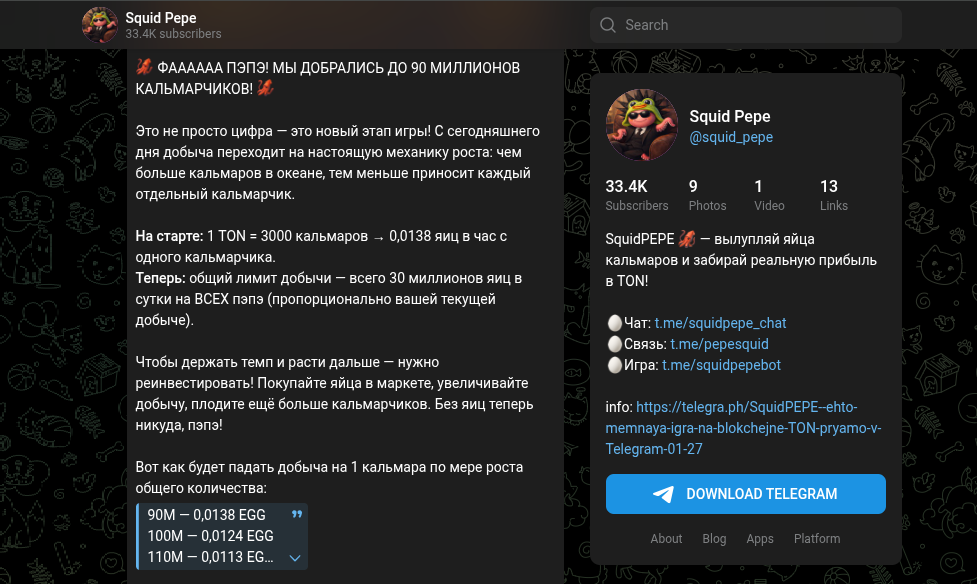 Squid Pepe — очередная попытка скрестить популярный мем с хайповой механикой Play-to-Earn на блокчейне TON. По крайней мере, так свое детище презентуют создатели. Анонимные разработчики запустили телеграмм-бота и предлагают нам покупать NFT-кальмаров, майнить токены и якобы зарабатывать реальную крипту. В этом обзоре мы разберем, почему здесь скорее обманут, чем дадут получить хоть какой-то доход.