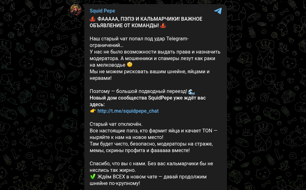 У проекта нет ни юридической регистрации, ни полноценного Whitepaper. Вся документация — простенький GitBook, где правила могут менять на лету. Более того, недавно админы провернули переезд в новый телеграмм-чат, якобы из-за спама. Обычно так делают, чтобы обнулить историю претензий и негативных сообщений в старом Squid Pepe Chat (@ Squidpepe chat). Доверия к настолько анонимной структуре у опытного криптоэнтузиаста априори быть не может.