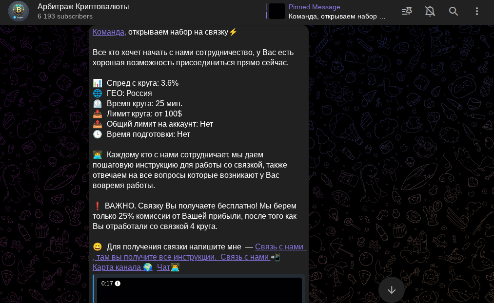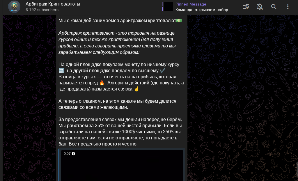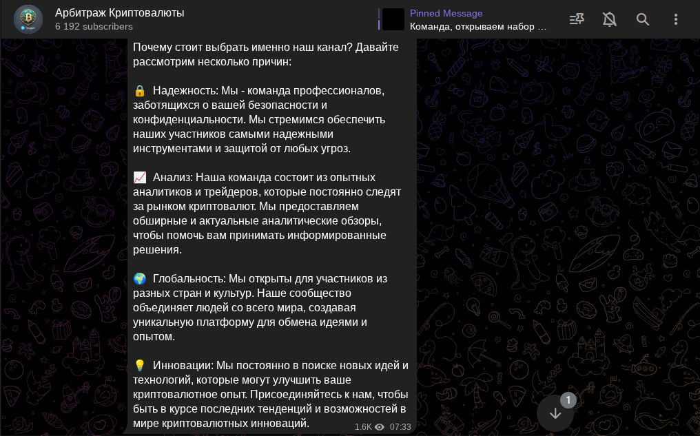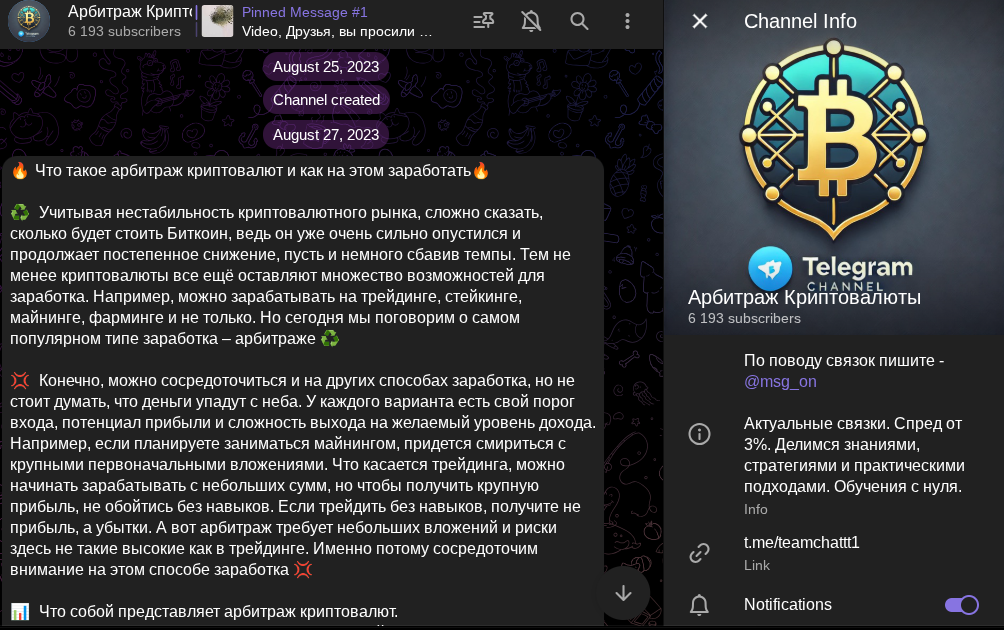Ко всему перечисленному, автор консультационного сообщества по работе с маркетами добавил, что подписчики получают развернутое обучение работе с цифровыми монетами. Телеграм-канал эксперт создал 25 августа в 2023 году и прикрепил сразу объяснением, что такое арбитраж криптовалют. Если вкратце, это выкуп подешевевшего токена, а потом его перепродажа на отскоке вверх.