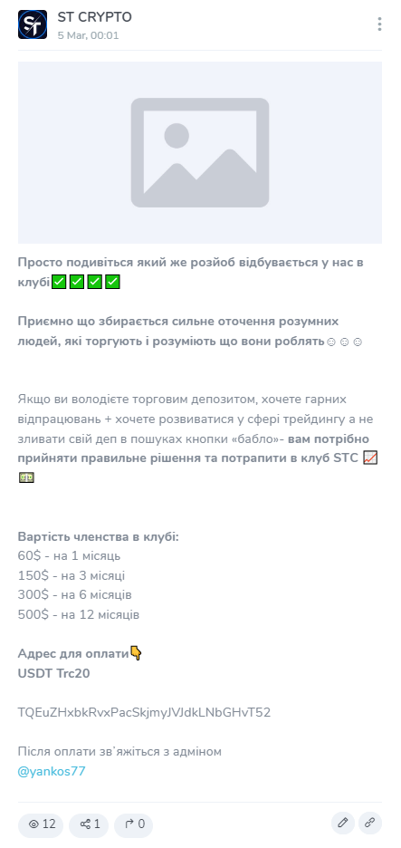St Crypto – это канал в Телеграме трейдера из Украины, посвященный заработку на криптовалютах. Аудитория паблика – 6600 подписчиков. Автор публикует контент на украинском языке. Он публикует бесплатные материалы для новичков. А еще он продает доступ в закрытый клуб. Монетизация Ст Крипто происходит за счет рекламы и публикации реферальных ссылок. А еще у трейдера есть вип-чат, доступ в который предлагается платно.