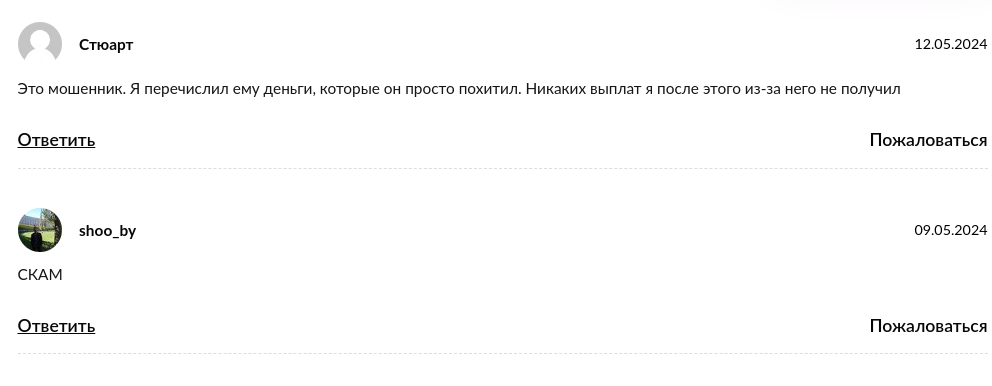 Положительной обратной связи от довольных подписчиков на канале нет — собственно, это для нас не стало удивлением. На независимых площадках представлены в основном негативные фидбеки и отрицательные рецензии. Пользователи сетуют на развод со стороны админа.