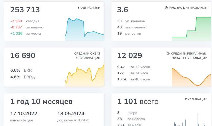 Подписаны на паблик в телеграмме свыше 250 тысяч человек, что кажется довольно внушительным количеством. Однако активность проявляют менее 10% аудитории, а это указывает на возможную искусственную накрутку аудитории.