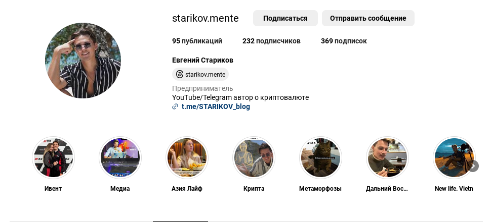 Евгений активно продвигает и собственный инстаграм — starikov mente. На этой странице проекта Starikov криптохукня и вовсе чуть более 230 подписчиков. Посты лайкают в лучшем случае до 20 человек.