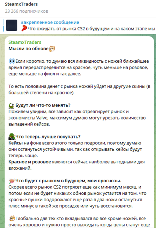 Контент на канале – это преимущественно рекомендации по вложениям в игровые валюты. Львиную долю внимания трейдер посвящает рынку CS2. Поэтому тематика канала не совсем совпадает с заявленной, о реальном трейдинге данных почти нет. Статистику своих сделок мужчина не публикует, открытого портфеля тоже не ведет. Мы не исключаем, что наш герой занимается исключительно раскруткой игровых аккаунтов и коллекционированием цифровых изображений и кейсов.