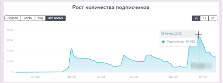 Буквально за пару месяцев канал набрал впечатляющее количество подписчиков – свыше 23 000. Но, при этом, просмотры не превышают отметку в 70-80. Это указывает на высокую вероятность накрутки аудитории. График динамики роста подписчиков скачкообразный – это показывает дни, когда автор покупал ботов.