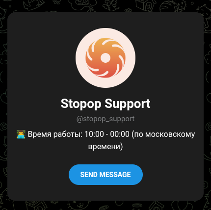 Важный момент – команда проекта себя не раскрывает, тут сплошные анонимы. Нет ни юрлица, ни лицензий, ни прозрачной информации о владельцах. Контакты сведены к фиктивному Телеграмм-аккаунту stopop support, да и тот существует только для вида. Написать в техподдержку, конечно же, можно, но в ответ обычно тишина или нелепые отписки. Никакой реальной помощи от условного менеджера вы не дождетесь.