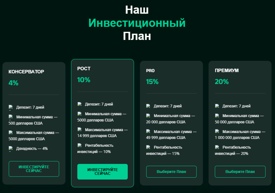 Компания предлагает клиентам на выбор 4 типа инвестиционных планов: