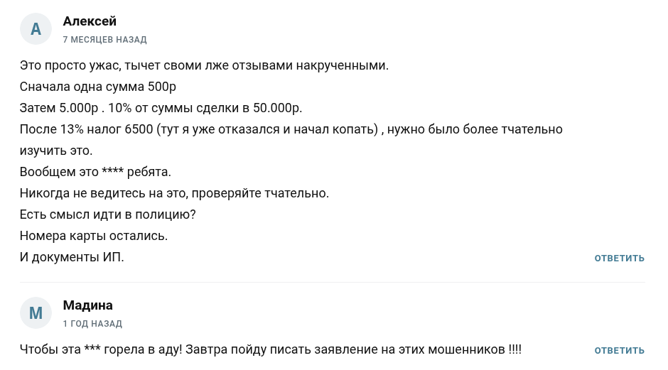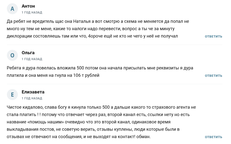 Реальные отзывы о @natalia 1nvestt на независимых площадках исключительно негативные. Люди теряют не только первый взнос, но и значительные суммы сверху, пытаясь вывести несуществующую прибыль.