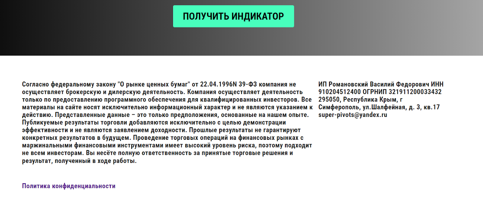 Доменное имя Level Beast online, где рекламируют оба индикатора, зарегистрировано в ноябре 2023 года. Количество посещений в месяц колеблется от 20 до 40 тысяч человек. Примечательно, что 75% переходов на платформу — реферальные ссылки, работа ведется исключительно на территории России. В качестве реквизитов указано ИП Романовский Василий Федорович, регистрация в Крыму. Осуществляется деятельность по предоставлению программного обеспечения для трейдеров, никакой финансовой ответственности нет. Контакты не указаны, ни социальные сети, ни телефон не опубликованы. Нет даже адреса электронной почты для связи, только форма заявки на получение индикатора.
