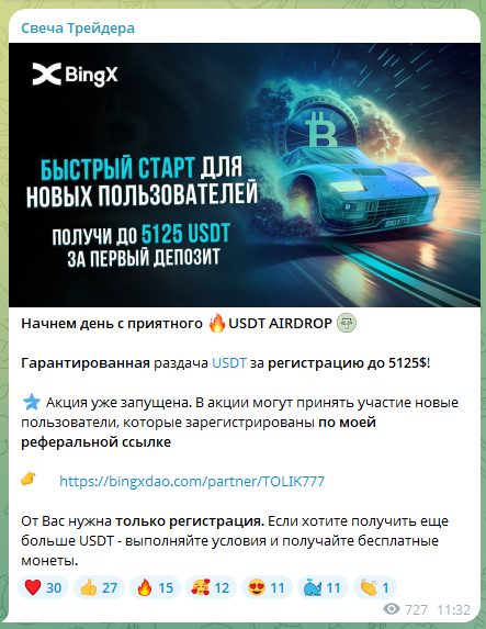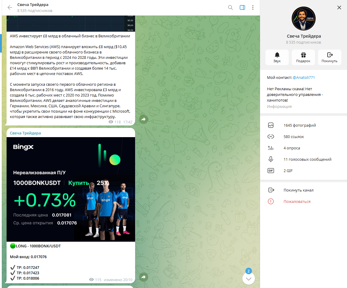 Проверка показывает, что Анатолий выстраивает образ профессионального трейдера: публикует экономические новости и демонстрирует скриншоты якобы успешных сделок. Однако такой контент выглядит как приманка для новичков. Новым пользователям обещают беспроигрышные сигналы и быстрый заработок, после чего их подводят к регистрации на криптобирже по реферальной ссылке. Далее следуют сигналы, которые на практике приводят к убыткам. В итоге подписчики теряют деньги, тогда как сам трейдер получает вознаграждение за счет партнерских отчислений криптоплощадки.