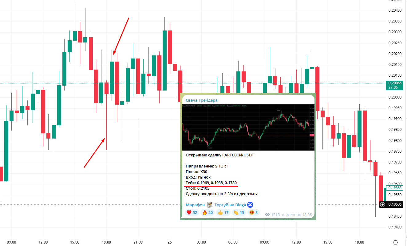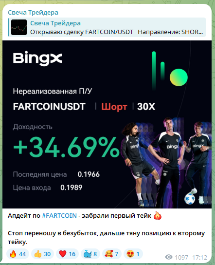 24 апреля 2026 года Анатолий опубликовал сигнал. В нем он рекомендовал шортить криптовалютную пару FARTCOIN/USDT с тейк-профитом 0,1969, 0,1938, 0,1780. Мы проверили и выяснили, что в этот момент монета опускалась максимум до 0,19799, а значит отложенный ордер не сработал. Следовательно, сделка принесла бы убыток. Остальные сигналы трейдера аналогичного качества.