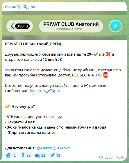 Условия и стоимость участия админ не сообщает. Для вступления требует написать в личку тг-аккаунта @ Anatoliy_e74pro. Подобную схему часто применяют скамеры, чтобы в переписке один на один склонить жертву к импульсивным решениям.