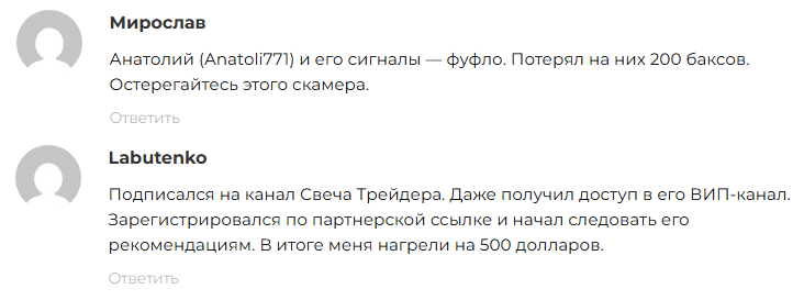 В интернете отзывов о «Свеча Трейдера» немного и все они негативные. Люди жалуются на плохое качество торговых сигналов. Почти все пострадавшие пишут, что потеряли деньги из-за рекомендаций Анатолия.