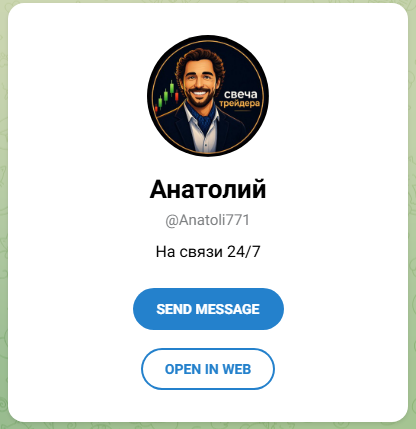 Владелец проекта «Свеча Трейдера» называет себя Анатолием. Он утверждает, что является профессиональным трейдером, а также привлекает новичков торговыми сигналами и гарантиями успешных сделок. Ниже разбираем деятельность этого специалиста, чтобы понять, стоит ли прислушиваться к его рекомендациям.