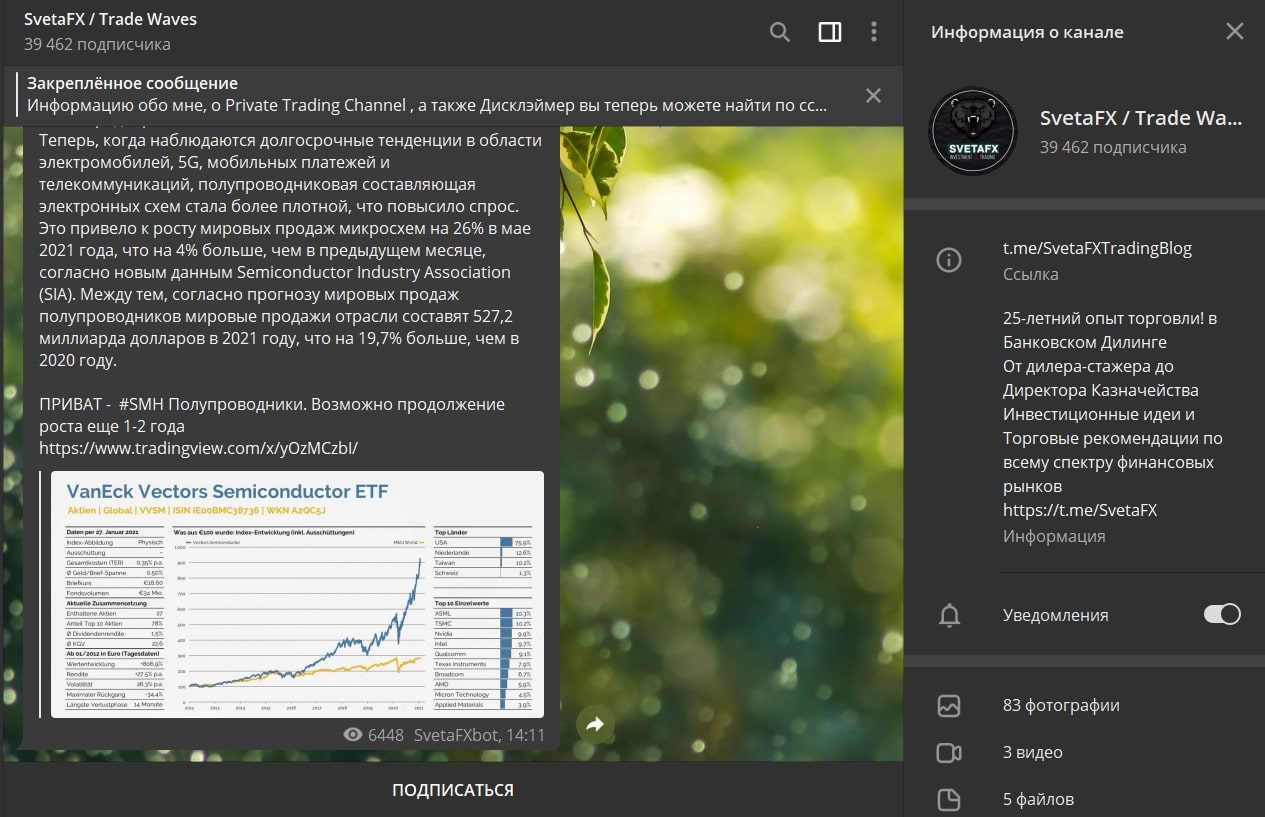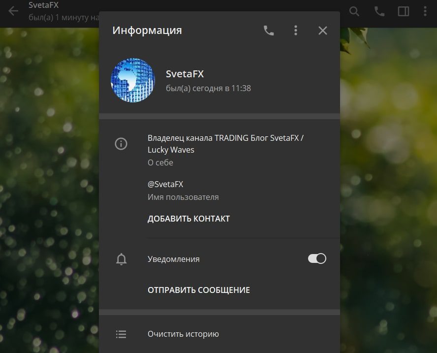 SvetaFX — телеграм-проект, на котором публикуются инвестиционные идеи и торговые рекомендации по всему спектру финансовых рынков. На данный момент аудитория телеграмм канала составляет более 30 тысяч человек. Автор материалов заявляет, что прошла путь от дилера-стажера до Директора Казначейства. Мы изучили предложения трейдера и подготовили обзор его работы.