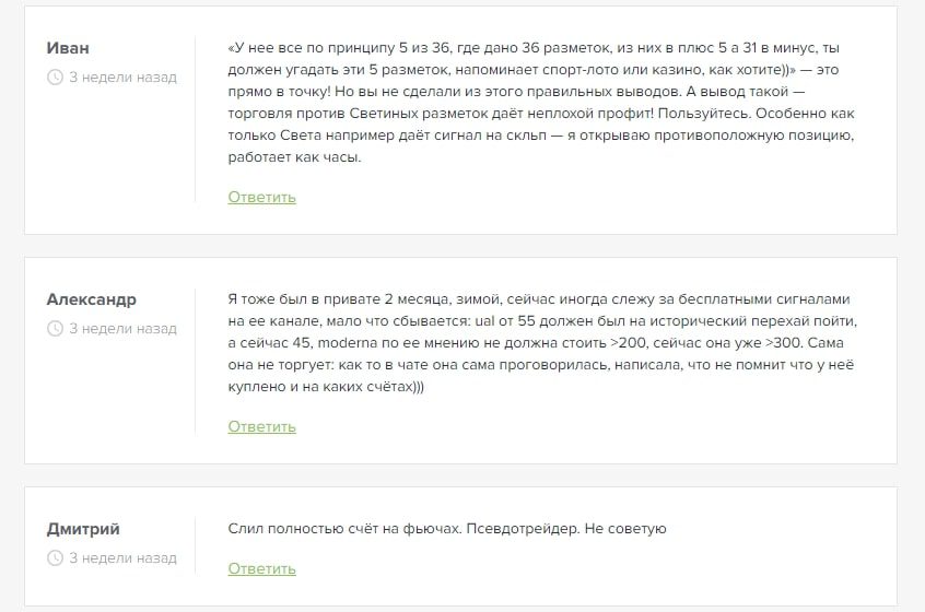 В отзывах многие клиенты рассказывают, что выбирают тариф без полного сопровождения профессионального аналитика. У данного трейдера сложилась крайне сомнительная репутация в интернете. Автор закрытого-телеграмм канала с сигналами, за которые пользователи платят большие деньги, сама не торгует на финансовом рынке. Об этом рассказал один из клиентов Светланы. По его словам, трейдер сама проговорилась, что не помнит, какие сделки она совершала в ближайшее время.