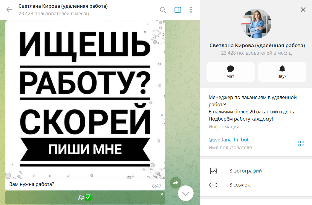 Услуги Светланы Кировой представляют собой автоматическую рассылку предложений о заработке в интернете. После запуска диалога пользователь подтверждает интерес к вакансиям, а бот начинает присылать сообщения с различными вариантами дохода онлайн.
