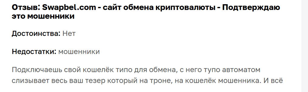 В сети масса негативных отзывов о Swopbel. Как пишут пострадавшие, для работы требуется подключить криптовалютный кошелек. До торговли или обмена дело не доходит. Сразу после привязки хранилища баланс клиента обнуляется. Это в чистом виде кража активов, повлиять на которую невозможно. Реклама сервиса идет в соцсетях, пользоваться площадкой призывают мелкие блогеры.