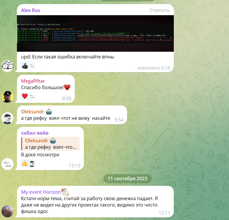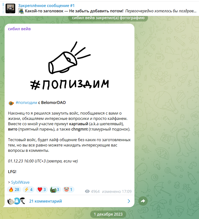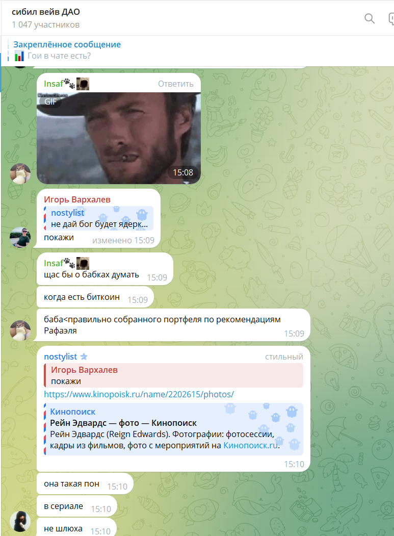 Админ почти не учит торговать на бирже или совершать выгодные сделки. Его основная цель – донести свои методы и систему работы с криптой. «Сибил вейв ДАО» появился летом 2023 года и вырос в коммерческий проект, правда, пока не очень известный.