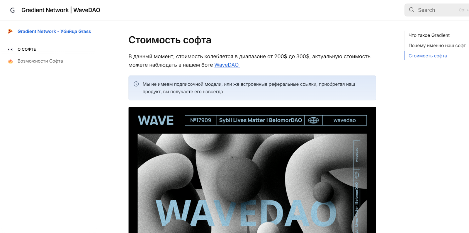 Кроме софта в бесплатном доступе они предлагают Gradient Network. Это ПО должно создать сеть для заработков наподобие GRASS. Стоимость участия разная: от 200 до 300 долларов. Детали можно уточнить в специальном боте. Создатели не обещают конкретный доход в процентах обладателям нового ПО.