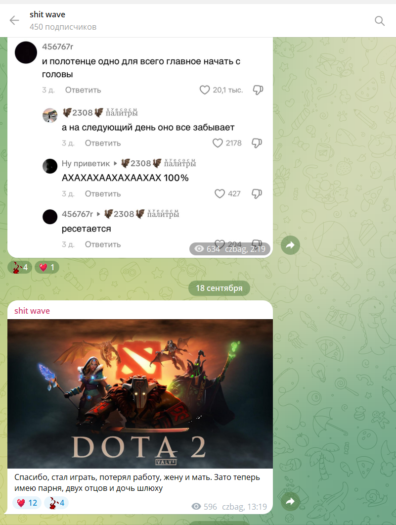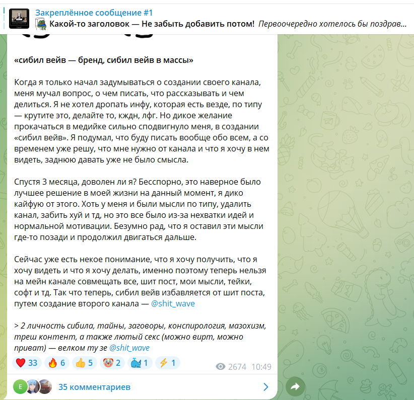 В основном канале Sybil wave – 4 568 подписчиков. Средний охват постов – 2891 человек. Признаков накрутки нет. Найти его можно, набрав sybilwave в поисковике.Админ создал еще один канал, когда научился отсортировывать контент. В сообществе с ироничным названием Shit wave всего 450 участников. Аккаунт у канала – shitwave.