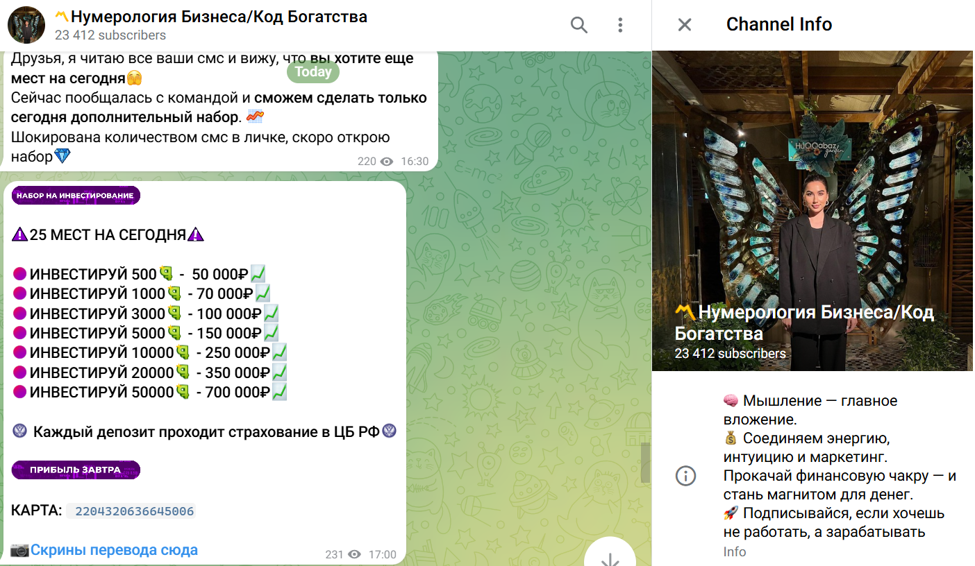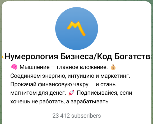 Канал изменил свое название с Тайны богатых Инвестиции с Нуля до Миллион на Нумерология бизнеса Код богатства. На несколько сотен активных подписчиков приходится свыше 23 тыс. накрученной ботами аудитории. Комментарии закрыты, чтобы случайные честные мнения не подмочили репутацию бизнес-проекта. Скорее всего, с той же целью скрыты все эмодзи.
