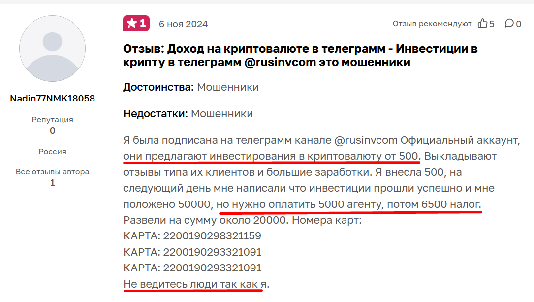 Данное сообщество еще не обзавелось богатым багажом откликов, однако отзывы об аналогичных проектах наглядно покажутся схему работы подобного жулья. После того как радостная Валерия сообщит о готовности переслать выплаты, она упомянет и необходимость оплаты комиссии. При этом с большой суммы, которая якобы вот-вот окажется в кошельке клиента, она взять данную комиссию не может. После комиссии последует следующий побор – оплата налога. Запрашиваемые побирушкой суммы варьируются примерно в районе 5000 и более.