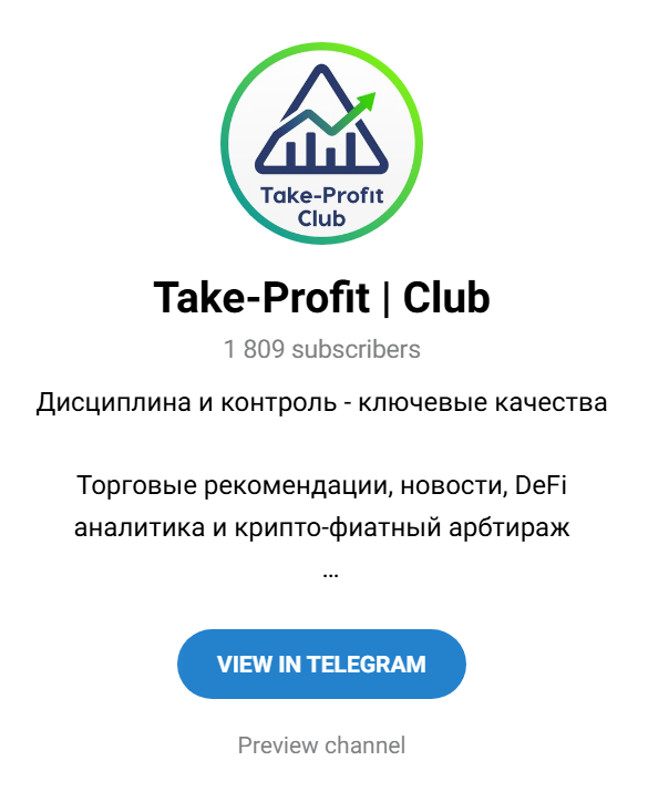 Телеграм-канал Take Profit Club (TakeProfitClub) создан в ноябре 2021 года. На момент написания обзора неактивен. Последний пост вышел в октябре 2025 года. Подписчиков осталось 1 809 человек. Активность публики низкая. Посты читали в среднем 500 участников, а реакций – не более 5. Видно, что проект не заинтересовал людей.
