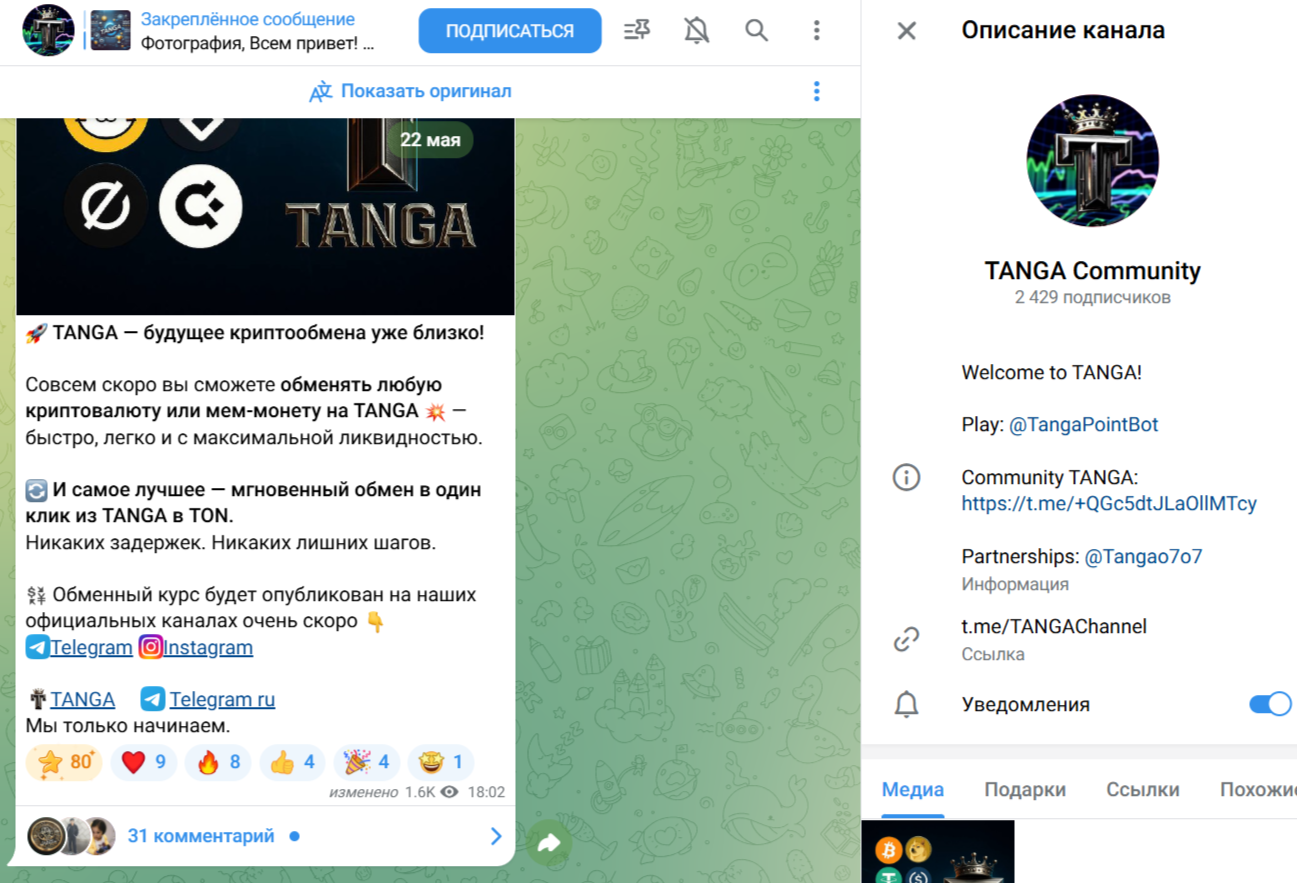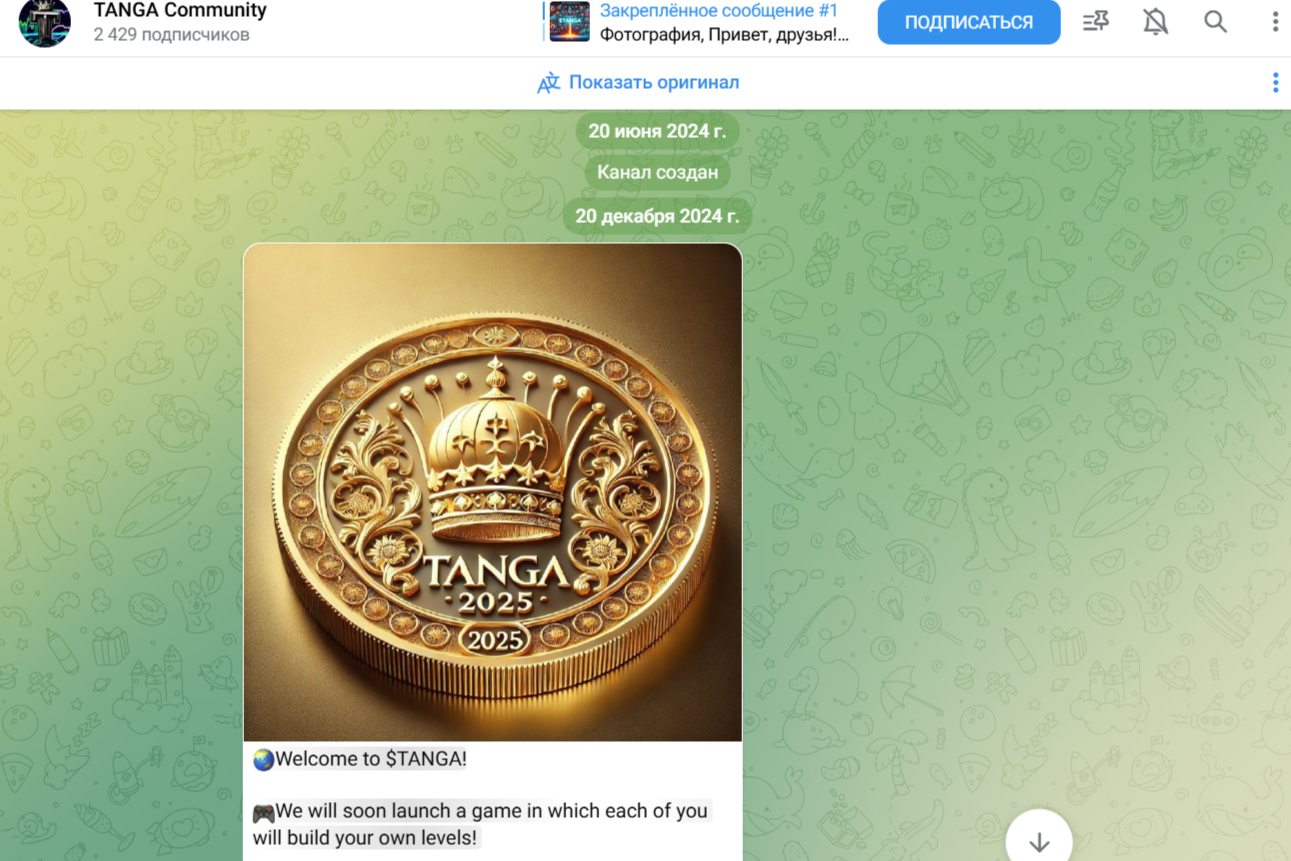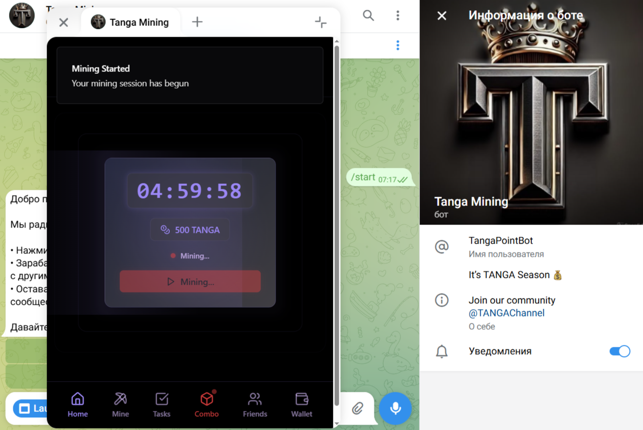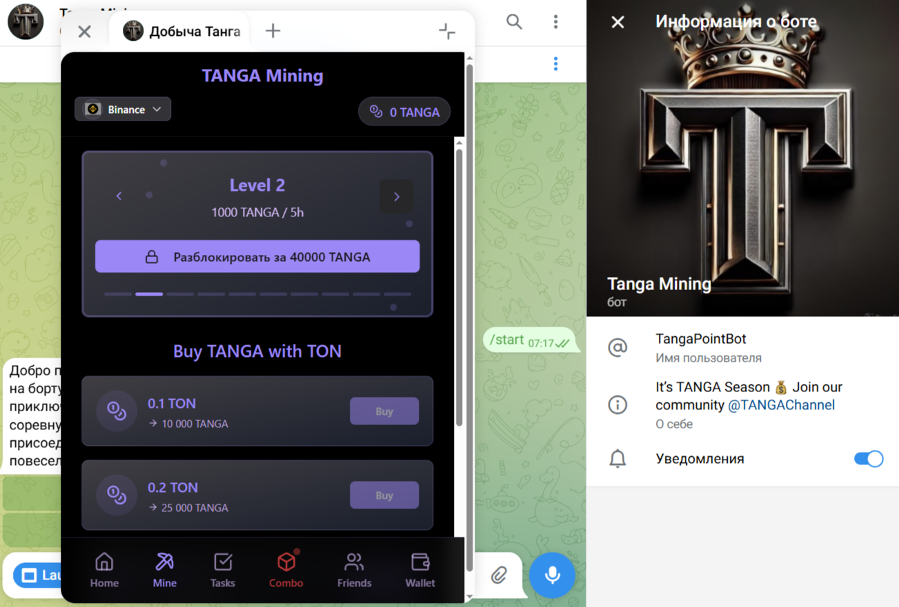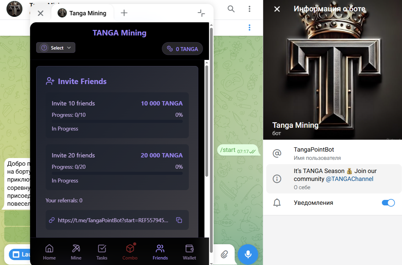 Инвестпроект для майнинга крипты появился в мессенджере в июне 2024 года вместе с дополнительными каналами @Tangao7o7 и TANGAChannel. Этот проект принадлежит анонимам. Его создатели не желают предоставлять пользователям данные об организации, лицензии или регистрационных документах, которые могут обеспечить пользователям возврат их вложений.