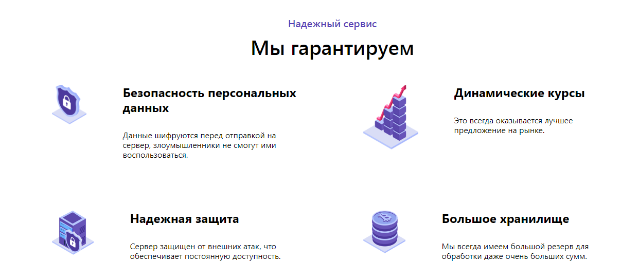 В описании сказано, что сервис использует динамические курсы и защиту данных (шифрование, 2FA, SMS). Биржа обещает динамические курсы, что позволяет трейдерам якобы торговать с выгодой. Также на сайте говорится о большом хранилище для обработки крупных сумм.