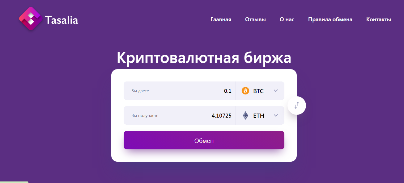 Сайт Tasalia com отзывы получил не лучшие. Это онлайн-платформа для обмена криптовалют, которая обещает своим клиентам мгновенную обработку транзакций, выгодные курсы и круглосуточную поддержку. На этой бирже пользователи могут обменивать токены, хранить их и получать пассивный доход. Обещания выглядят стандартно – все это предлагают и другие биржи. В чем особенность «Тасалиа» и настоящая ли это криптобиржа – расскажем далее в статье.