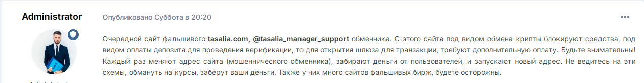 В сети есть отзывы о Tasalia, в которых пользователи предупреждают, что это скам. По их словам, это очередная мошенническая платформа, которая завлекает новичков выгодными курсами. Но вывести деньги не дает. Tasalia manager support блокируют аккаунты, требуют платную верификацию, выманивая у жертвы еще больше денег. Но блокировку все равно не снимают, а жаловаться некуда.