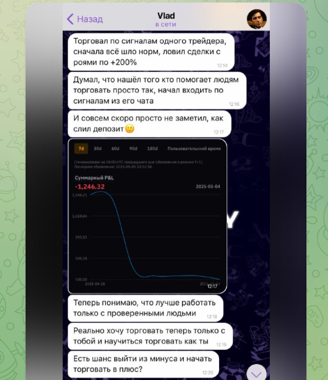 Информация о стоимости и иным условиями подключения к проекту также отсутствует. Все вопросы, касающиеся добавления новичка в команду, обсуждаются индивидуально. Не исключено, что Иван Гаврилов зарабатывает на партнерских программах бирж, куда ведет клиентов. После подключения новоиспеченные трейдеры получают сигналы, которые далеко не всегда являются прибыльными.
