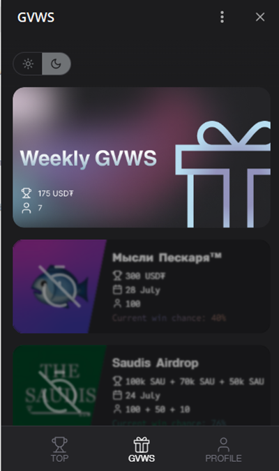 На его главном экране появится список актуальных конкурсов и розыгрышей. Пользователь может выбрать понравившийся розыгрыш, кликнуть на него и появится подробный перечень условий. Их необходимо выполнить, чтобы претендовать на выплату. Размер призового фонда, как правило, небольшой — от 100 до 500 USDT.