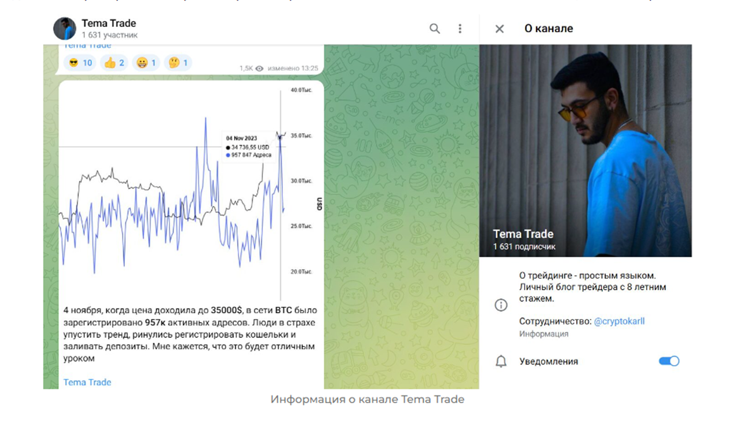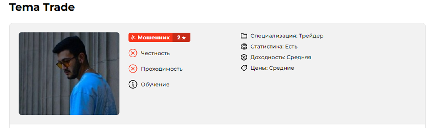 Кто стоит за проектом Tema trade — неизвестно. Якобы его создатель трейдер, торгующий криптой с восьмилетним опытом. Мужчина обещает подписчикам, что научит их торговать своим примером, а его идеи сделок принесут долгожданный плюс на счету. Но, как водится, это все только красивые обещания.
