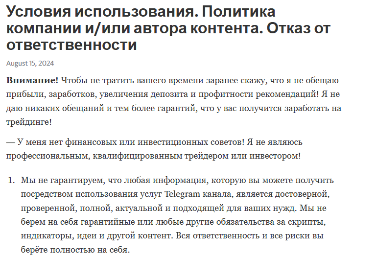 В описании канала есть ссылка на «Условия использования канала». Автор снимает с себя всю ответственность. Не обещает прибыль, не гарантирует результат, не является профессиональным трейдером. Зачем тогда следовать его советам, если он сам в них не уверен – непонятно.