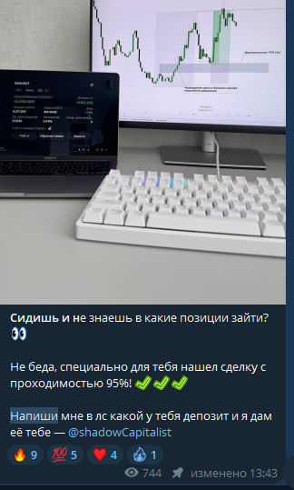 Контент бесплатный. Но есть предложения платных услуг. «Сделка с проходимостью 95%, напиши какой депозит» – классическая схема для втягивания клиентов в платные консультации, где начинается настоящий развод на серьезные суммы.