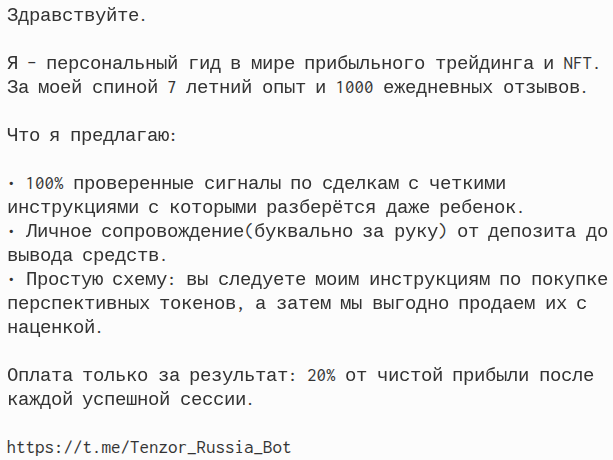 Помимо вышеперечисленного, телеграмм бот Tenzor Russia часто используют «аналитики», ссылаясь на готовую стратегию. Они обещают 100% выигрышные сигналы и сопровождение вплоть до положительного результата. Как только подписчик клюет на наживку, в ход вступает схема с платными транзакциями.