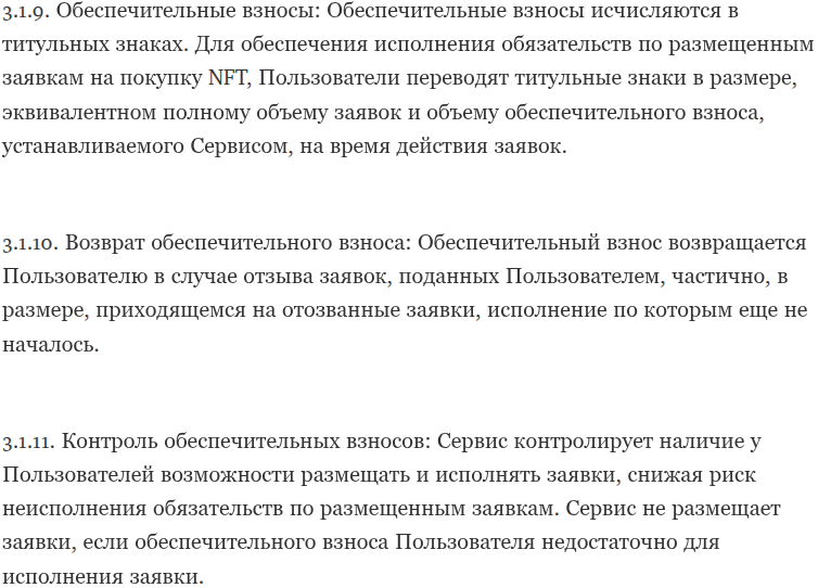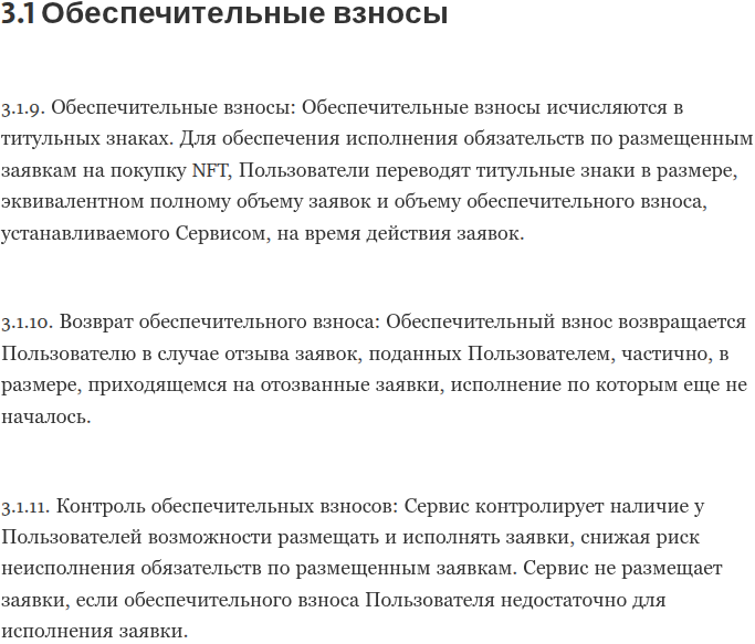 При изучении правил мы нашли пункт 3.1. про обеспечительные взносы. Проще говоря, маркетплейс взимает еще залог за покупку или продажу активов. Однако реальных гарантий компенсации, кроме приписки о возможном возврате, нет.