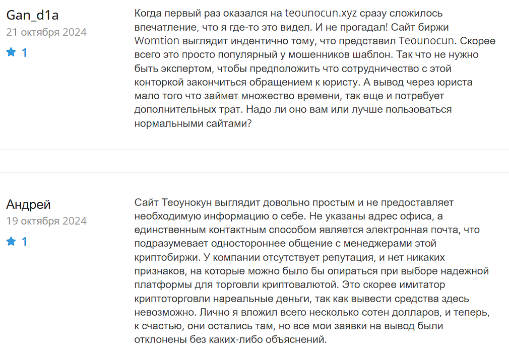 Так как криптовалютная биржа Teounocun работает недавно, отзывов о ее работе практически нет. Те, что имеются, написаны в явно негативном стиле. Пользователи заявляют, что их заманили на эту платформу мошенники, которые обещали легкий заработок на криптовалюте.