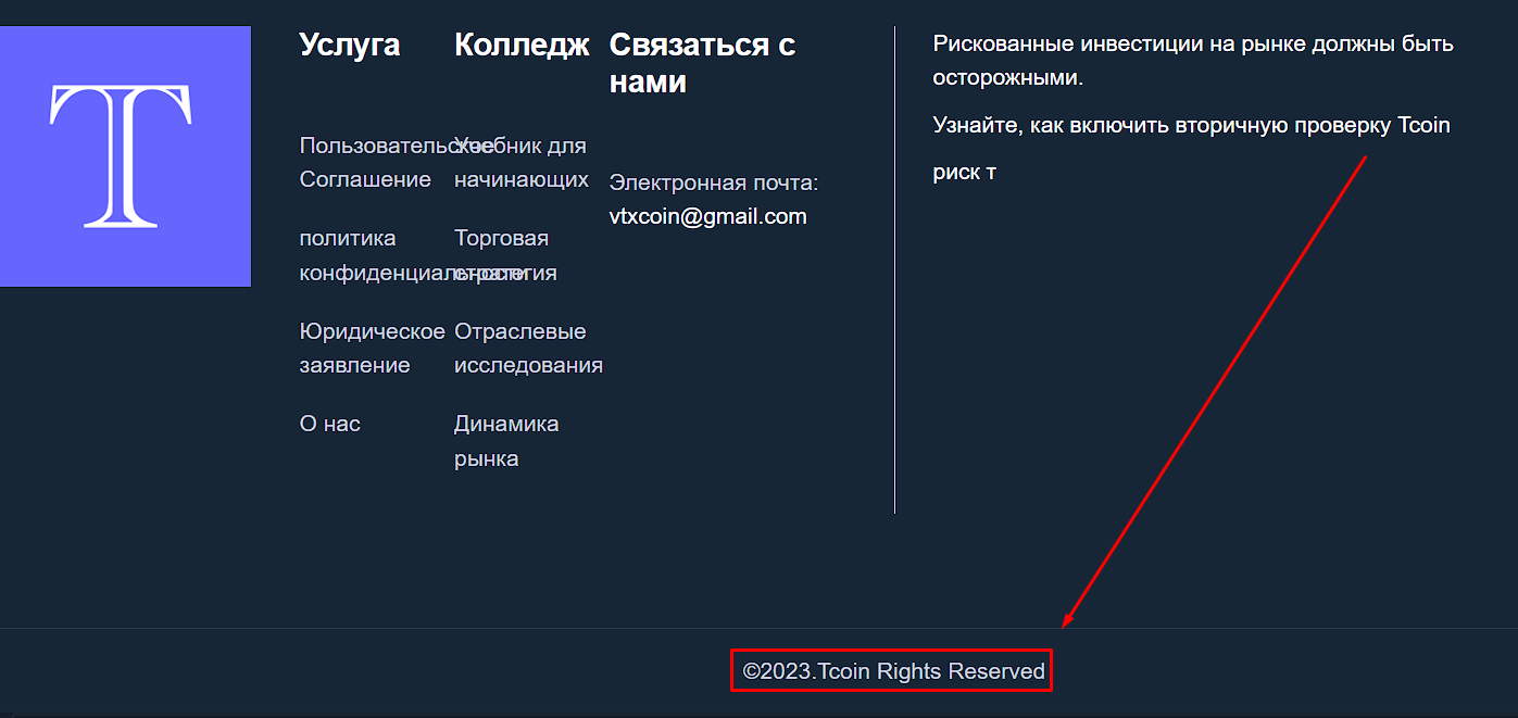 Начнем с того, что криптобиржа Teounocun полностью скопировала сайт другой платформы под названием Tcoin. Этот сервис оказался мошенническим и спустя некоторое время был закрыт. Причем скопирована буквально каждая страница. Даже в футере сайта красуется название Tcoin 2023.