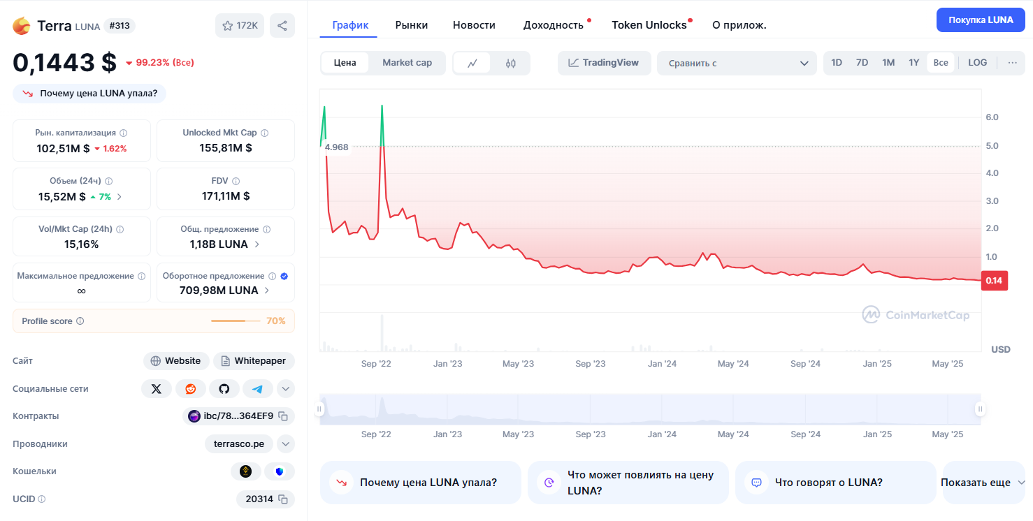 От листинга криптовалюты Terra Luna отказались немало криптобирж, например, Coinbase. Никакого «прекрасного завтра» инвесторы в токен так и не дождались. После скама 2022 года монета так и не смогла «воскреснуть». Сейчас инвестировать в криптовалюту «Терра Луна» решаются все меньше пользователей, даже на фоне общего роста альткоинов график криптовалюты Luna продолжает свое падение.