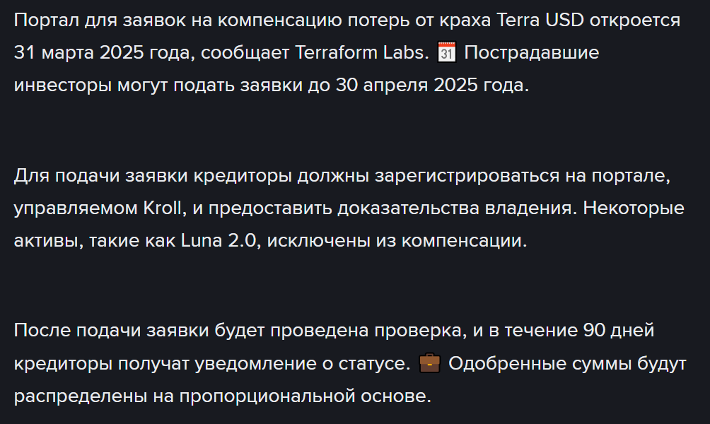 Только в 2025 году Terraform Labs запустили систему компенсаций. До 31 марта пострадавшие могли оставить кролл-заявку «Терра Луны» и вернуть часть потерянных средств обратно на кошелек. Однако, судя по отзывам на тематических ресурсах, это удалось сделать лишь единицам.
