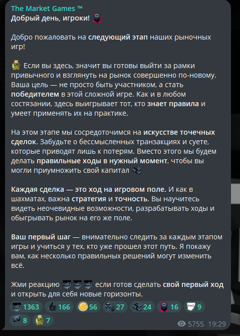 Телеграмм-канал The Market Games был создан 9 апреля 2024 года, но первый пост появился уже 1 ноября. Это говорит о том, что сообщество могло быть выкуплено у предыдущего владельца. Примечательно, что активность в ноябре ограничилась всего лишь несколькими постами с сигналами, и уже 15 января 2025 года был опубликован анонс игры, система участия в которой пока что остается загадкой.Все указывает на то, что канал The Market Games является заготовкой, формирование которой началась еще в ноябре 2024 года. Запуск именно в январе 2025 связан с премьерой 2 сезона известного сериала, элементы сюжета которого присутствуют на проекте.