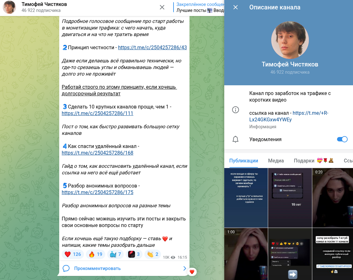 Канал Чистякова в Телеграме создан для монетизации его курсов по созданию и продвижению Ютуб-каналов с короткими видео. Его главный продукт — программа Система, в которой Чистяков рассказывает, как создать сетку каналов и работать с ней так, чтобы выйти на доход от 150 тысяч руб/мес. В ленте канала много скринов переписок с якобы успешными учениками Тимофея и прочих маркетинговых приемов. Но проверить реальность этих отзывов невозможно.