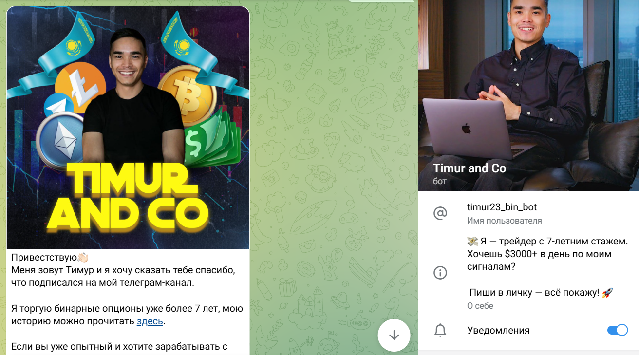 Создатель проектов в Телеграме «Тимур и его команда» и Trader Timur ne bot отзывы в интернете имеет крайне негативные. Собственником упомянутых каналов является трейдер по имени Тимур. Он предлагает всем желающим торговать на биржах с прибылью 3 000 долларов в день. Обещает доходность сделок 90%. Стоит ли вкладывать финансовые инвестиции в «успешного» трейдера – узнаете из нашего нового обзора.