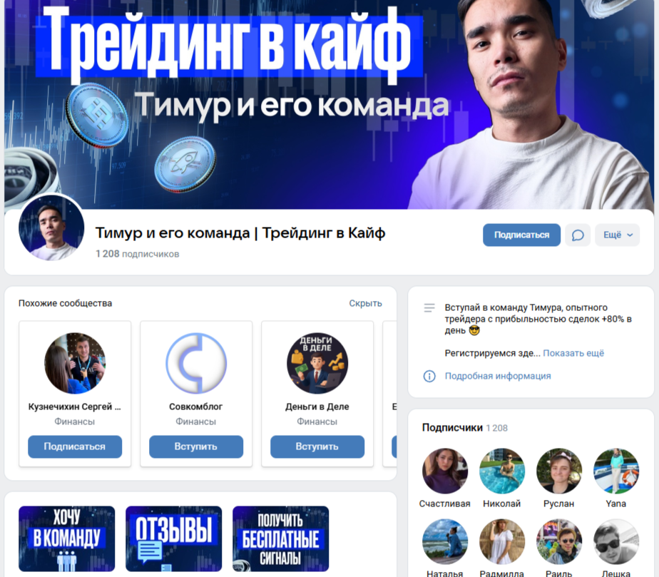 Проект «Тимур научит Трейдинг в кайф» (timurandcom) пользователи увидят в ВК. Здесь группа появилась в январе 2025 года. Она имеет 1 208 подписчиков. Контент группы содержит призывы увеличить собственный доход и рассказы о шагах к финансовой свободе. Публикации автора малоинформативны, поэтому практически не просматриваются пользователями.
