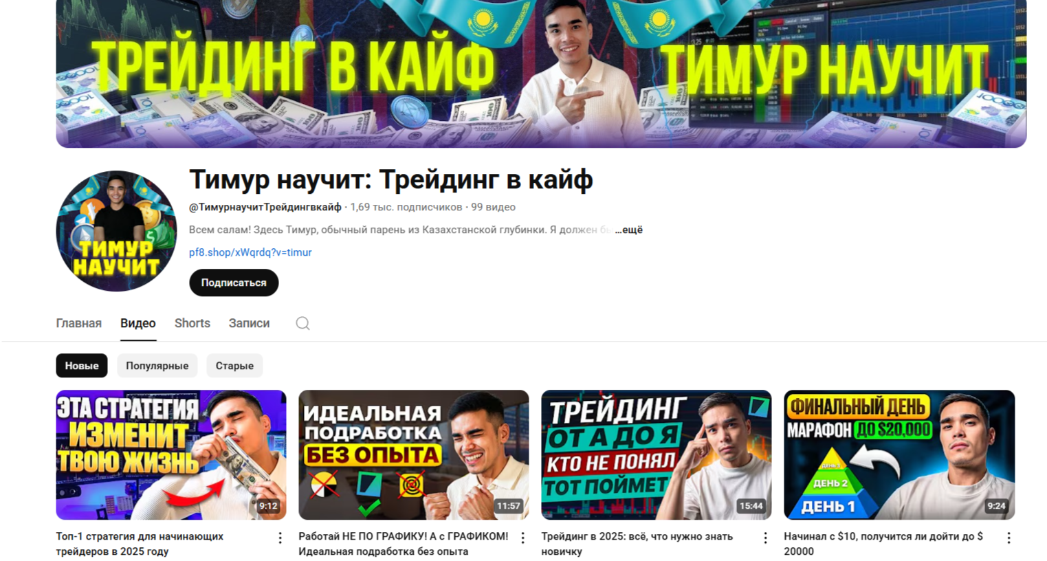 Зарабатывать вместе эксперт с сомнительной репутацией предлагает пользователям не только в Телеграме. Канал «ТимурнаучитТрейдингвкайф» существует на Ютубе. Этот проект появился в ноябре 2024 года. Ресурс имеет 1 690 подписчиков. На канале размещены ролики про ТОП стратегий для начинающих трейдеров, разгон депозитов и т. п. Единицы видео набирают до 1 900 просмотров, что говорит о низком качестве контента.