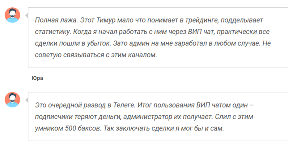 Отрицательные комментарии о работе трейдера Тимура в мировой паутине найдены были. В них проекты автора называют очередным разводом в Телеге и обвиняют в непрофессионализме.